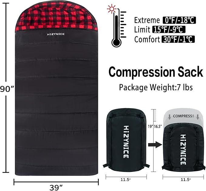 0 Degree Sleeping Bag 100% Cotton Flannel XXL for Adults Big and Tall Cold Weather Winter Zero Degree Camping,Free Compression Sack
