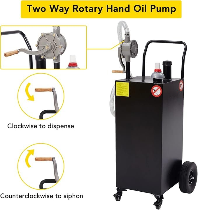 • Designed for portability and user-friendliness, the gas caddy comes with wheels and a hand pusher for easy mobility. The vent/fuel level gauge allows for convenient monitoring of fuel levels, while the reversible rotary hand pump offers added convenience by minimizing waste.