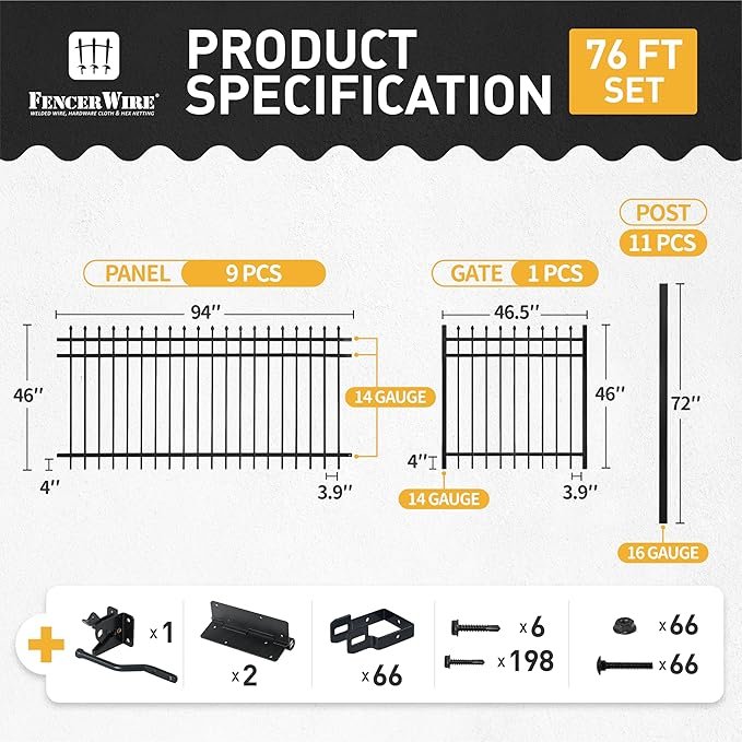 Fencer Wire 76FT Heavy Duty Pinnacle Fence Barrier Kit, Anti-Rust Metal Steel Fence with 4FT Height X 8FT Width Panels, Gate, Posts, Connectors, 2” Diameter Outdoor Fencing for Yard, Pool, Patio