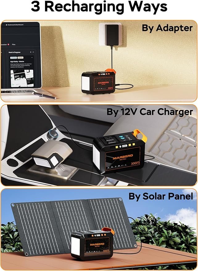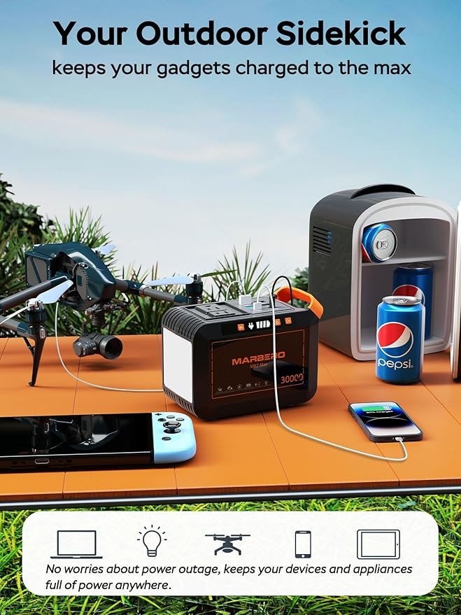 SOLAR GENERATOR WITH SOLAR PANEL: Looking for a reliable power solution for your outdoor adventures? Look no further than the MARBERO Solar Generator M82MAX paired with the MARBERO 30W Solar Panel. Whether you’re camping in the wilderness or embarking on a road trip, this powerful duo ensures you have access to electricity wherever you go. With its large capacity, this portable power kit is perfect for overnight stays or extended periods off the grid. Say goodbye to worrying about charging your devices and hello to uninterrupted outdoor fun!