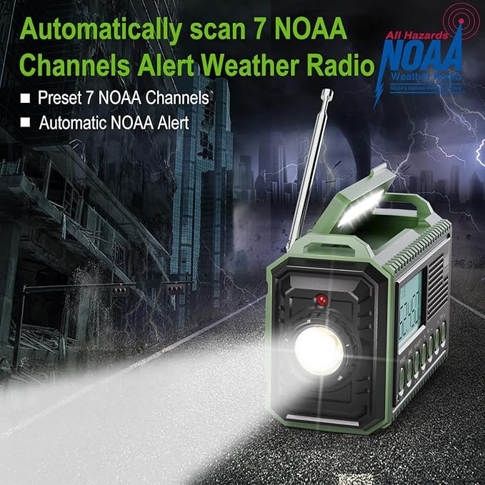 EMERGENCY RADIO & SOS ALARM – When hurricanes, tornadoes, earthquakes, flooding, or other emergencies may occur, an NOAA alert radio can provide life-saving information. A built-in super-bright 3W flashlight and 2.5W reading lamp are critical if the power outage. It also includes a USB connector used to charge your USB-enabled smart devices for communication. Simply press the SOS button that